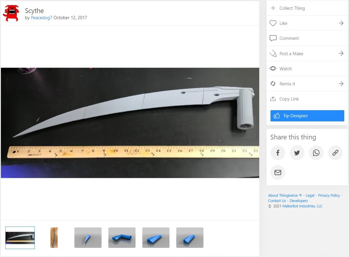 If the Grim Reaper is more your style, you could look at this Scythe Head project by Peacedog7. You will need a stick to attach the head to, but this is a great way to create a scythe that will be safe to carry with you on your Halloween adventures. This project comes in separate pieces to make it nice and easy to print.