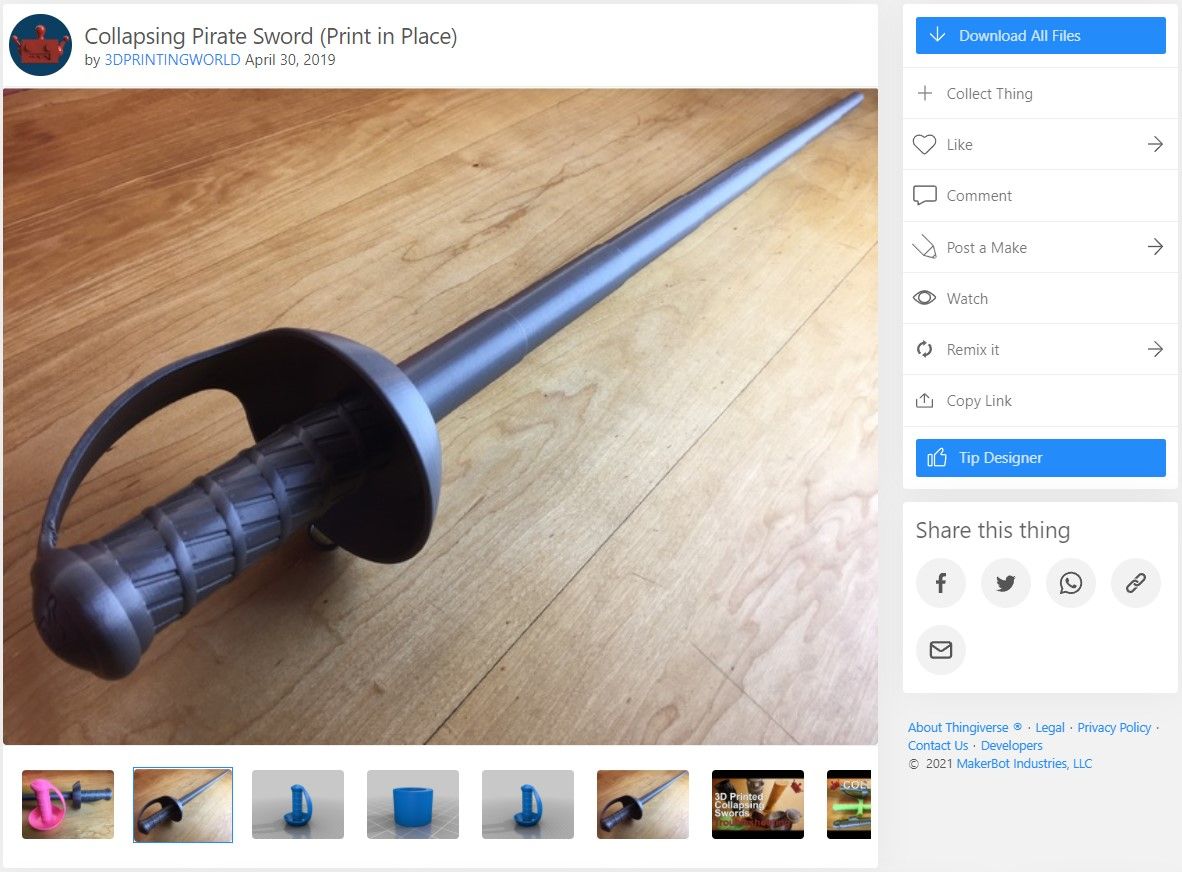 The first 3D printed costume accessory we’re looking at is a Collapsable Pirate Sword by 3DPrintingWorld. This project can be printed as a single piece, making it possible to print with just about every printer on the market.