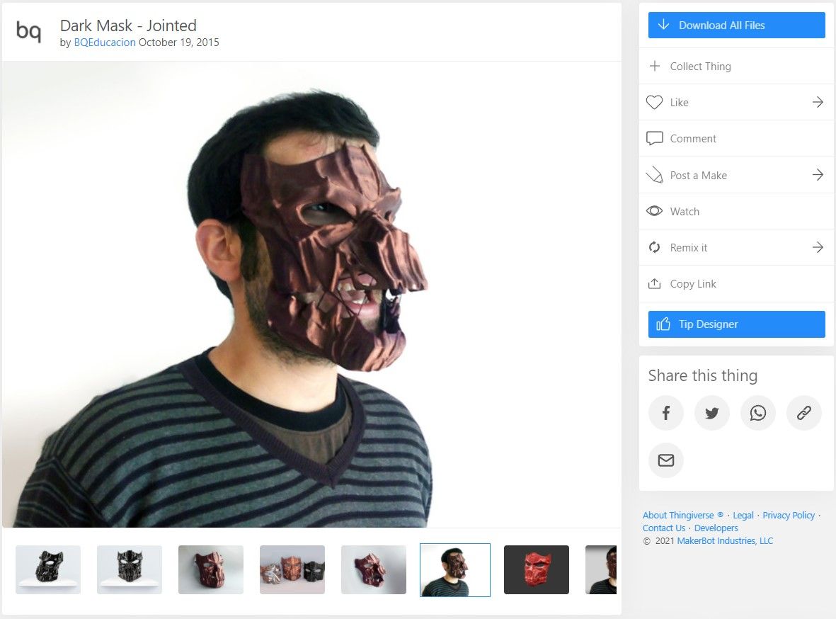 This Dark Mask by BQEducacion on Thingiverse is a great example of a super spooky mask project for your Halloween costume. With a hinged jaw, this mask can move with your mouth for an eerie effect.