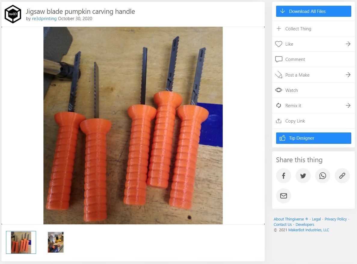 If you would prefer to keep things simple, this Jigsaw Blade Handle by Re3DPrinting will give you the chance to make a precise cutting tool that is ideal for pumpkin carving. This is a very easy project to print, though you will need to source a jigsaw blade for yourself.