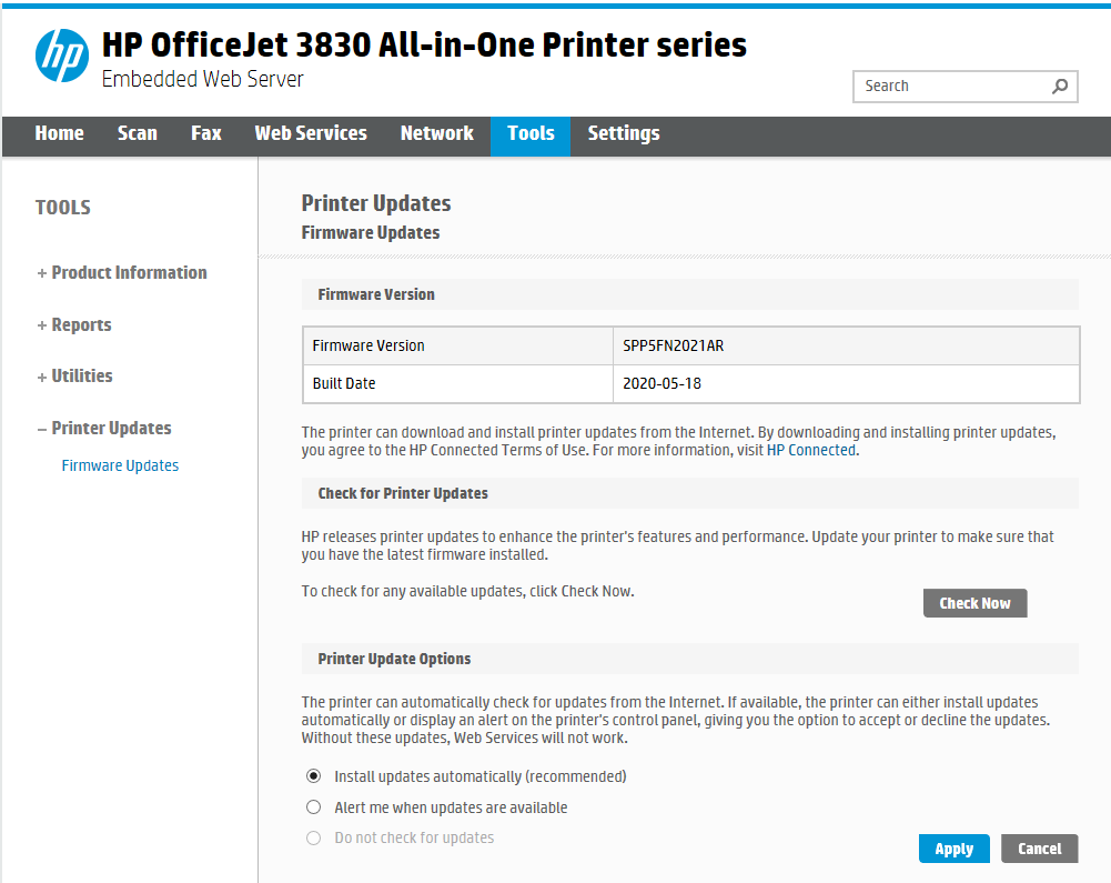 If your printer has an interactive display, you can likely use that to check for updates. For instance, on an HP OfficeJet model, you can go to Setup > Printer Update to check for the latest updates. This also lets you choose to install new updates automatically, which you should do for convenience.