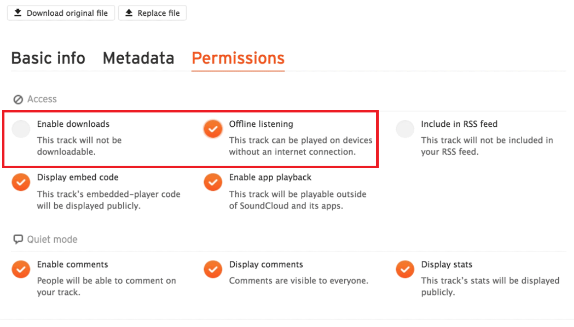 If you are a creator, you can toggle the two options on and off by heading to a track’s edit page, clicking on the Permissions toggle, and marking the checkboxes next to Offline Listening and Enable Downloads as needed.