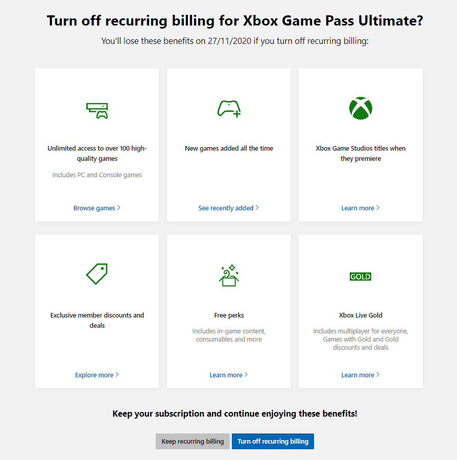 Not so long ago, Microsoft used to simply let you turn off auto-renewal with the click of a button. Now, if you want to switch off recurring billing (useful when you have a Game Pass code or Xbox gift card) you can follow the steps above.