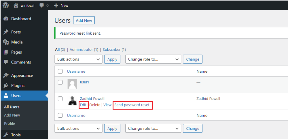 After that, choose the User whose password you want to alter and hover the mouse over their profile. A few options including Edit and Send Password Reset, will appear.