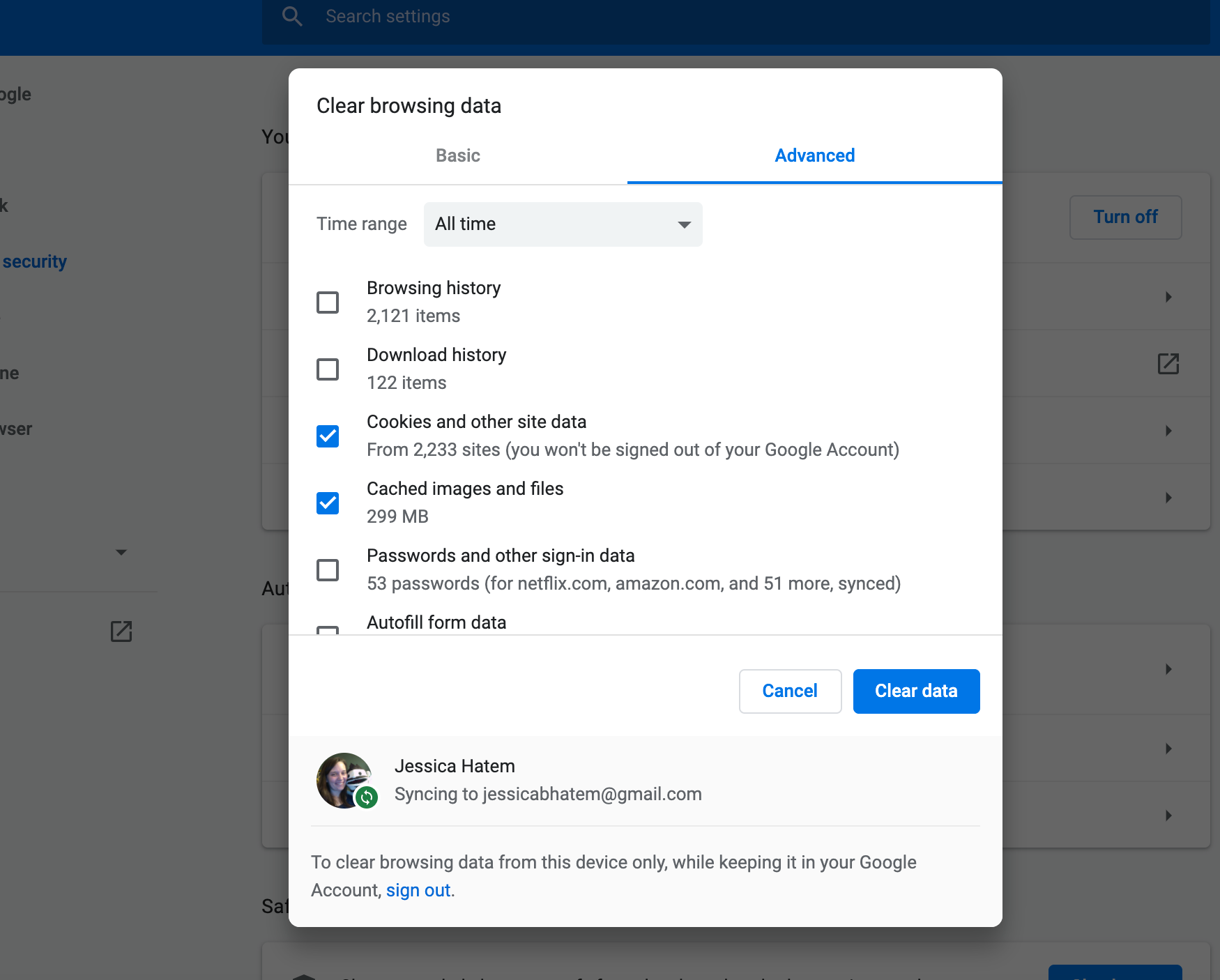You’ll be brought to a window labeled Clear browsing data within Chrome’s settings. In here, click on the Advanced tab and check the boxes beside Cookies and other site data as well as Cached images and files.