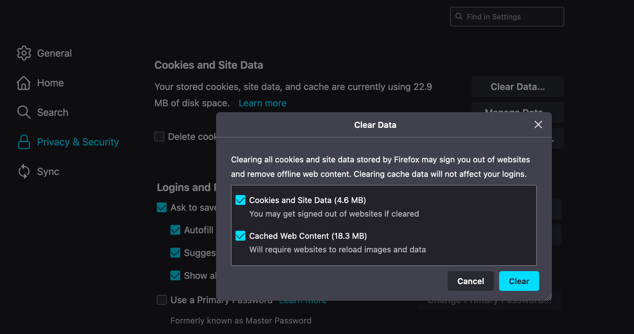 Firefox is another browser that conveniently lets you clear your caches and cookies in one place.