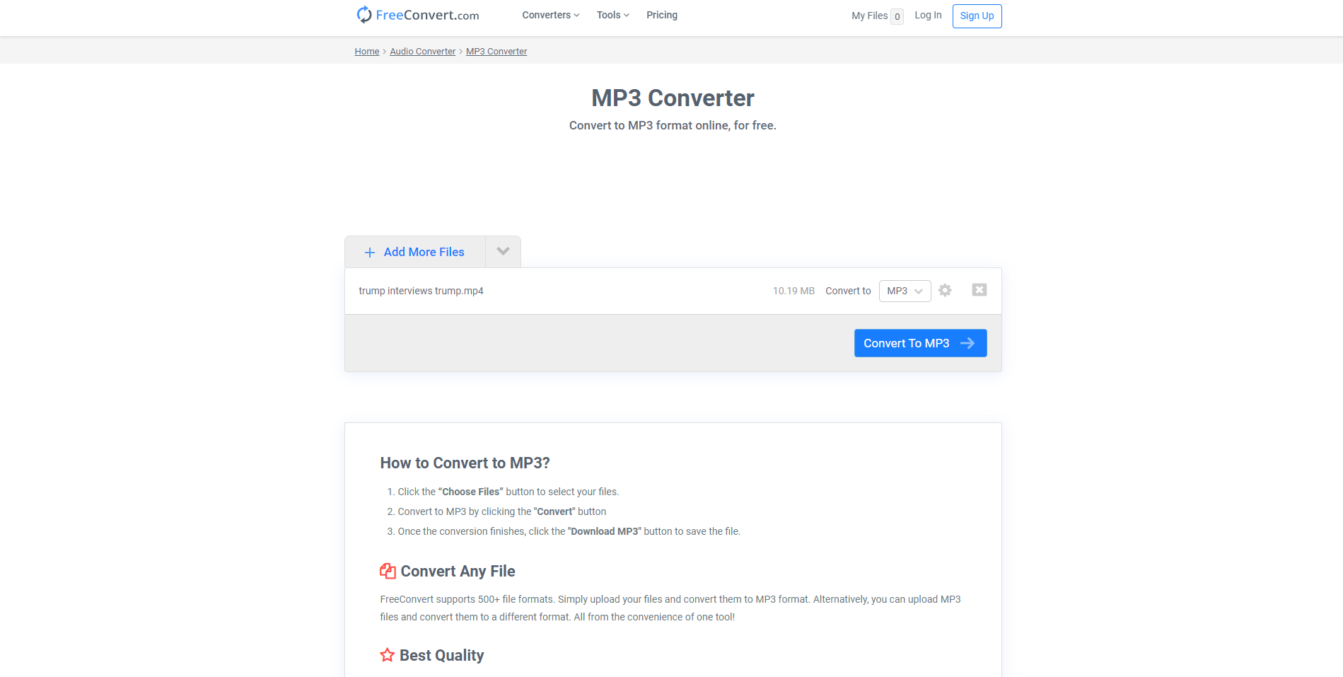 Go to the FreeConvert website, and under the Music Converters heading, click on MP3. Now click, Choose Files and select the MP4 that you wish to convert. Select Convert to MP3, and your file will be uploaded and converted.