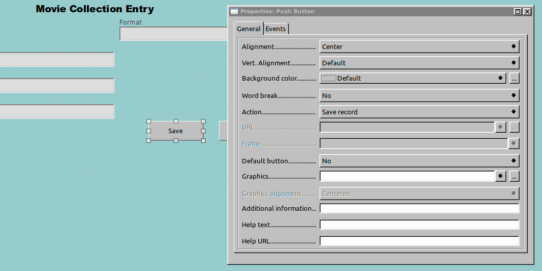 Create the button with the Push Button tool again, setting the name and label in a similar way as before, but set the action to Save record.