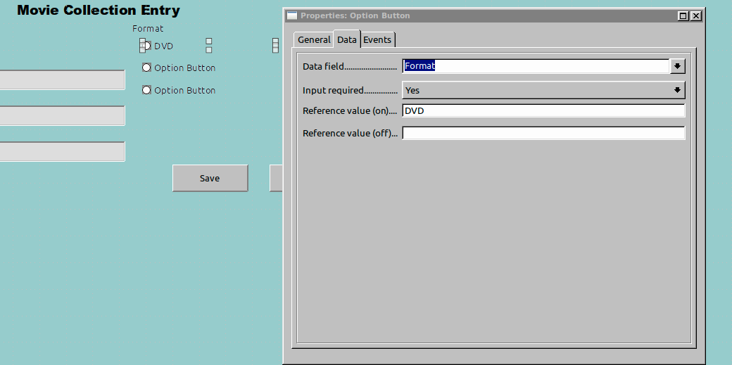 Then, in the Data tab of the Properties dialog, set the Data field to whichever field you want this option button to control. In the Reference value (on) box, enter the data you want entered when the button is selected. You can leave the Reference value (off) box empty.
