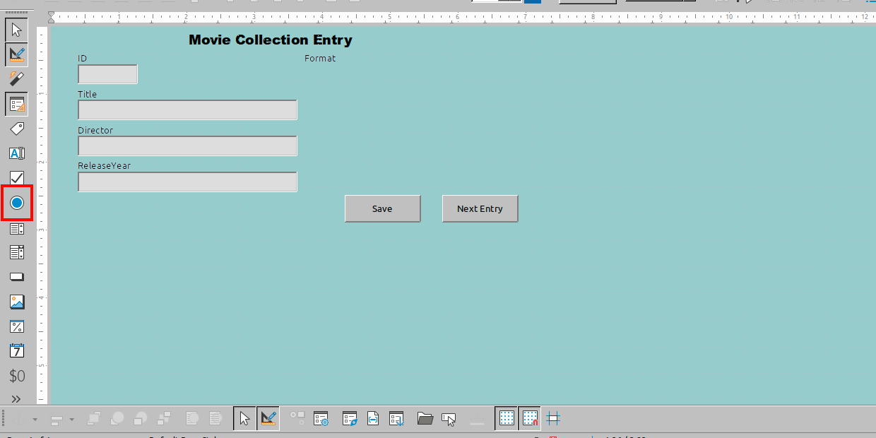 We’re going to replace one of the text boxes in our form, the Format field, with option buttons (also called radio buttons). If one of your fields is always going to contain one of a few limited options, an option button allows you to quickly enter that data without typing it every time.