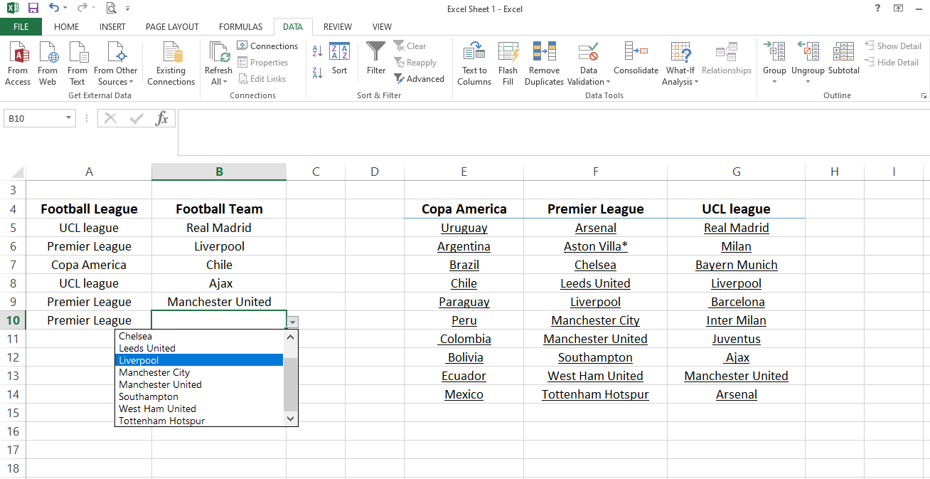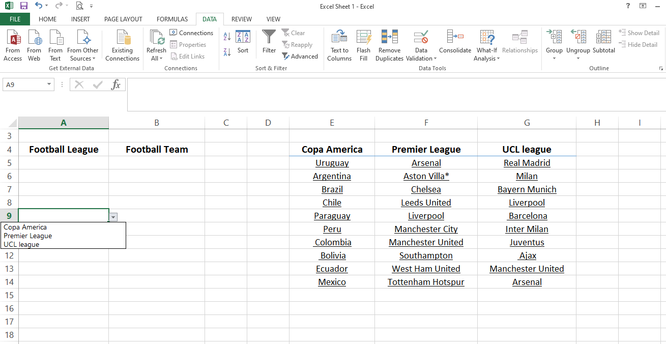 Once executed, the formula will generate multiple dependent drop-down menus for football teams.