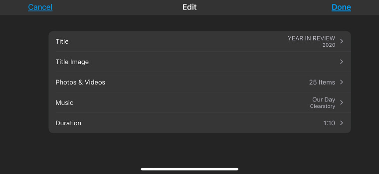 Tap on the Edit button to change the Title, Title Image, Photos & Videos, Music, and Duration of your Memory slideshow.