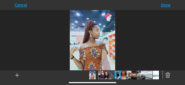 Tap on Photos & Videos to view the items currently included in the slideshow. You can swipe through the gallery, and tap on the plus (+) at the bottom of the screen to add more files. Tap on the bin to delete the ones you don’t want in the slideshow.