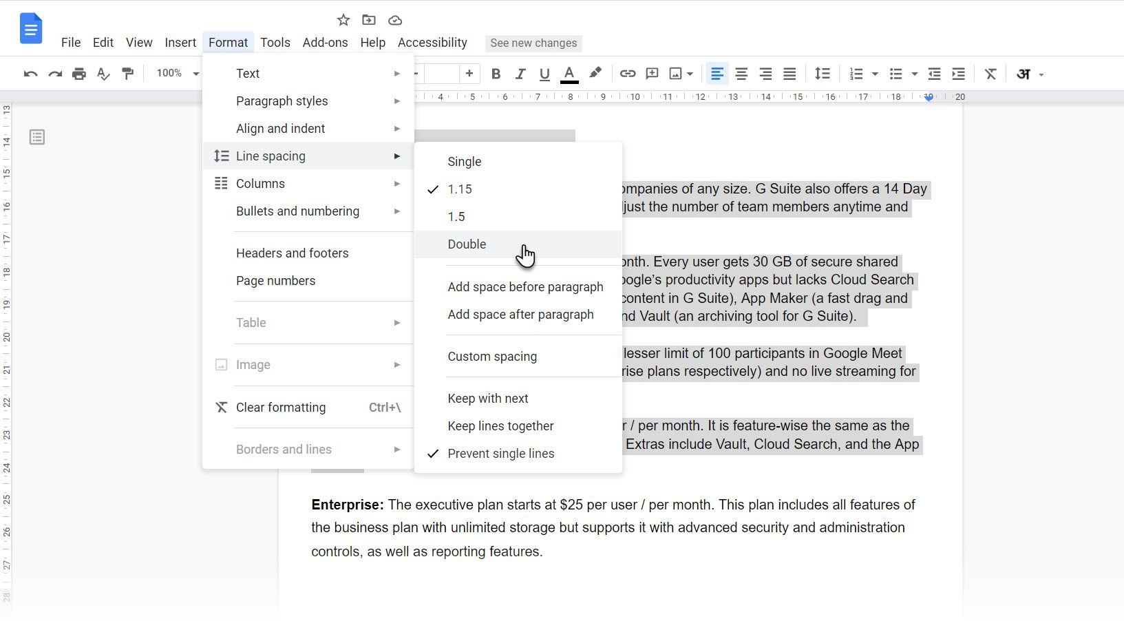 This is one of those Google tips that takes seconds but has an effect on the entire document. The right line spacing is not only important for readability, but it can also be a style requirement. For instance, the APA and MLA style guides insist on the double spaced text. Also, adjust the line spacing first if you need to fit a document into a fixed number of pages.
