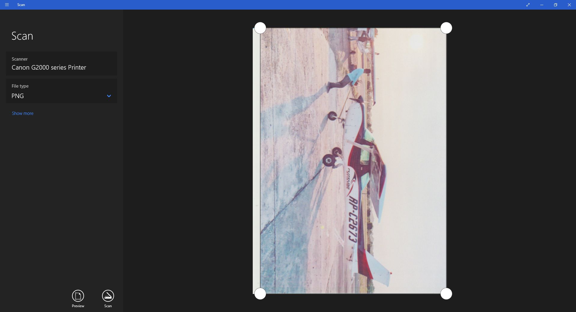 A new Scan window will appear. If you have multiple scanners, pick out the correct device, select the File type you want to save your scan, and then press Preview. You will then see your scan in the main window. You can also adjust the edges of your file by dragging and dropping the white circles at the corners of your file.