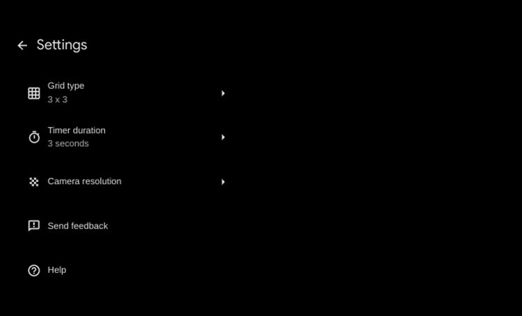 In the Settings menu, you get to set up the grid, camera resolution, and timer according to your choice. It also has the option to send feedback regarding the app and to view the help page.