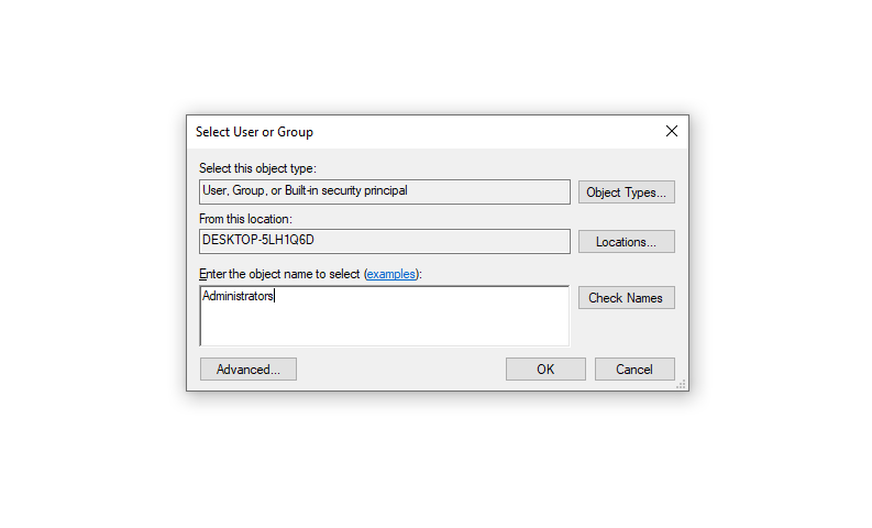 Click on Change to change the owner. Type Administrators in the Enter the object name and select field and press OK.