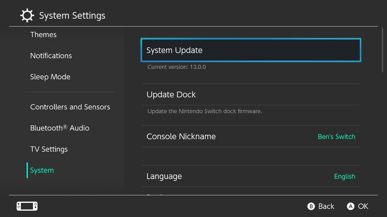 To check for the latest system updates on your Switch, select the System Settings icon from the home screen. Then scroll down to System on the left sidebar. In the resulting menu, choose System Update.