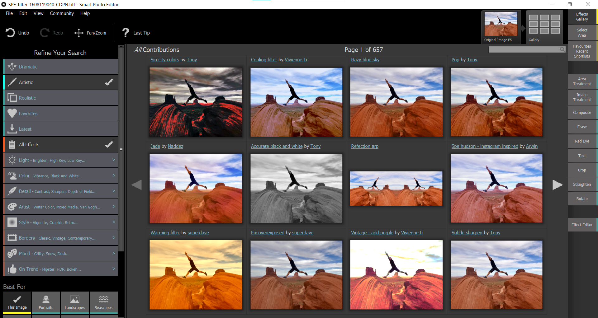 The Effects Gallery is a community-based initiative that offers its users the opportunity to choose from hundreds of effects that have been created specifically for Smart Photo Editor users. Thanks to the Smart Photo Editor community, there is a wide variety of special effects to choose from for specific photo editing needs.