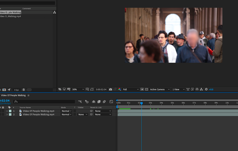In this case, the clip with a tracking mask is placed on top of the original with the Apply Matte checkbox ticked. A blur effect is applied to the face.