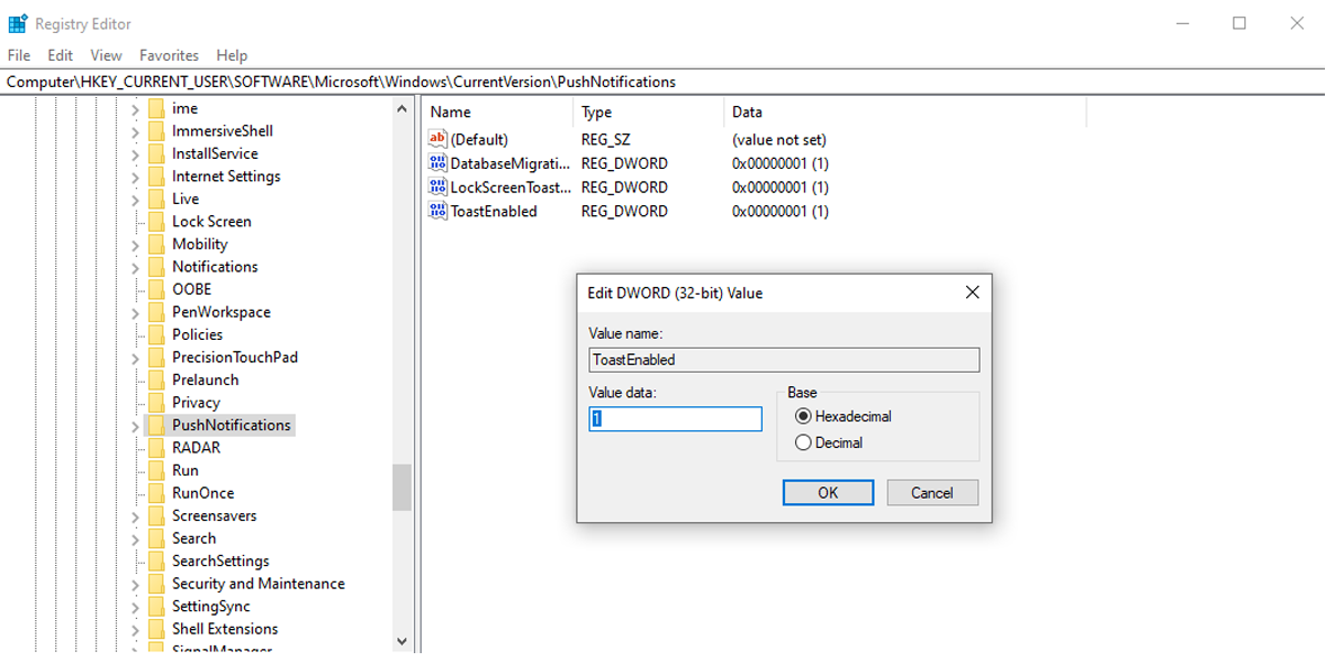 - Head to HKEY_CURRENT_USER > SOFTWARE > Microsoft > Windows > Current Version > Push Notifications.