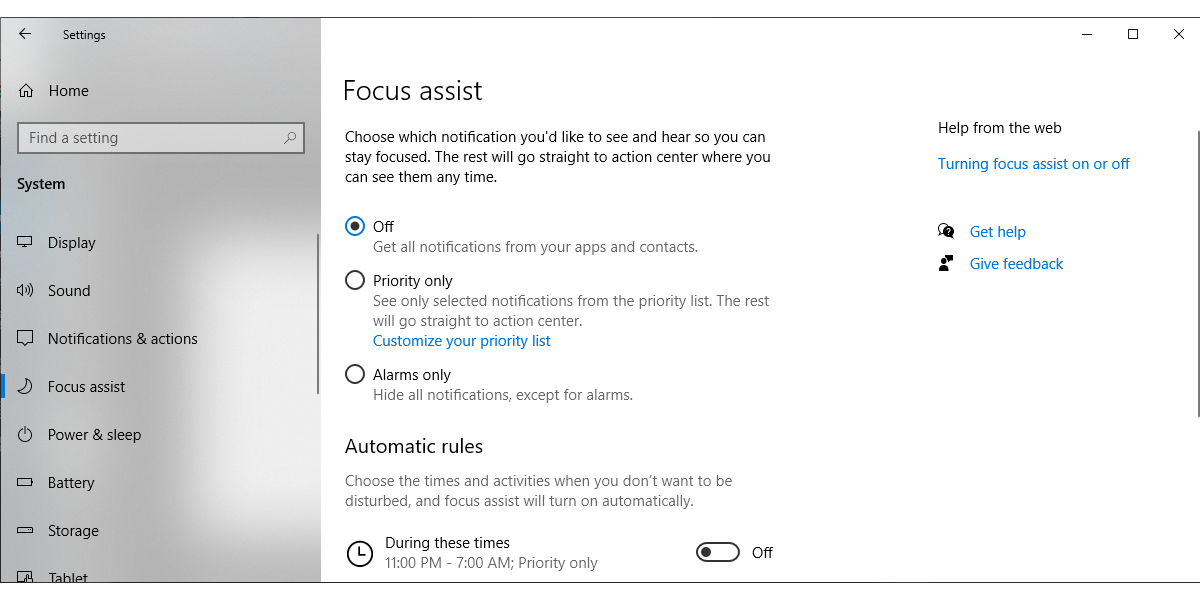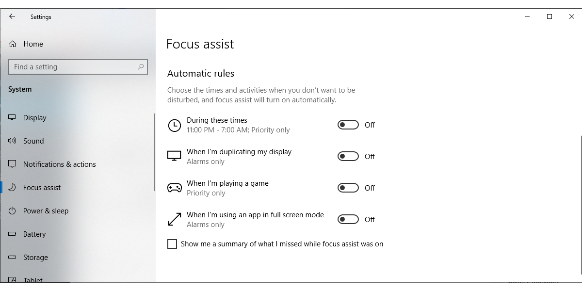 Check the Automatic rules section to make sure Focus Assist doesn’t turn back on by itself. You can turn it off for all options.