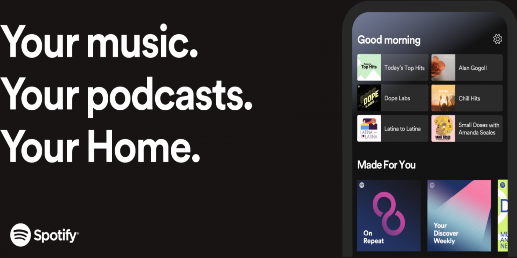 Spotify’s new home screen greets you with “Good Morning,” “Good Afternoon,” or “Good Evening” depending on what time of day you log into the app. Directly underneath this is a rotating selection of albums, podcasts, and playlists.
