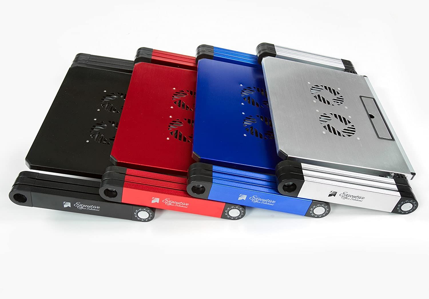 The Executive Office Solutions Portable Adjustable Aluminum Laptop Desk comes in four different colors. The three 360-degree rotating joints can be adjusted to a selection of positions to offer the best comfort wherever you go.