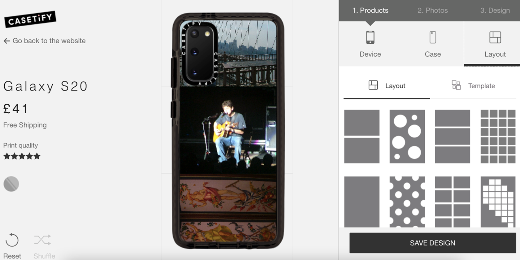 With Casify, you can choose one of the most common case covers (iPhone, Samsung, iPad, MacBook), pick a template for one or several pictures, and design your custom gift.