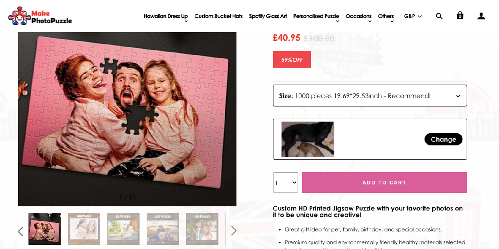 Make a Puzzle lets you create a puzzle from your pictures in mere seconds. All you have to do is pick the type of puzzle, the number of pieces, upload a photo, and add it to the basket. They also offer collage puzzles or ones that are holiday-specific.