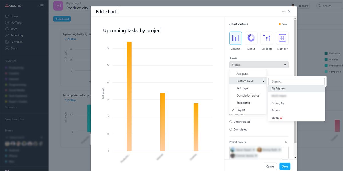 Asana reporting tool offers many chart customization options. You may choose the type of the chart and its color after selecting the project for your report. You can further modify the X-axis and Y-axis data of the graph.